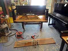 ピアノを寝かして底板等の取り外し準備 底板には埃がたまる