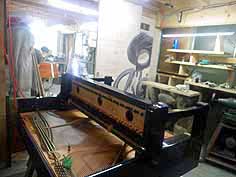 ピアノを寝かして底板の取り外し、ピアノは寝かすことにより細部にまで目が行き届くし手を入れることができる