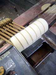 穴に通して引っ張り上げて膠をつけて張りこみ駒で圧着押さえつける