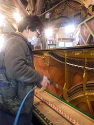 パネルを取り外してアクションをおろして鍵盤を取り外す〜〜先ず細部にたまる埃を一回吹き飛ばす