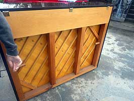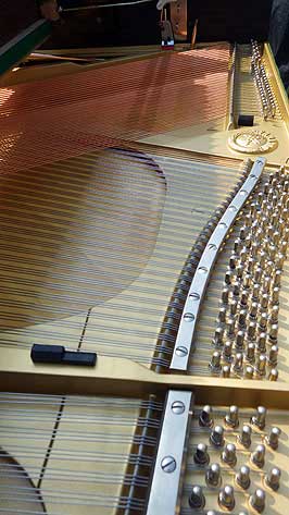 ピアノを寝かいsて底板取り外しと弦磨き等、この作業は寝かすことによりふっだん見えなかったより細部まであらわに見える