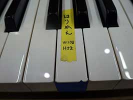 けん盤木口、ピアノ中央に当たるところなので一番目立ちやすいここが黄ばむとピアノはたちまちふる〜〜〜く見えてしまう