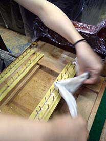 キーピン関係の磨きと棚板の掃除、鍵盤下位置にあるところ