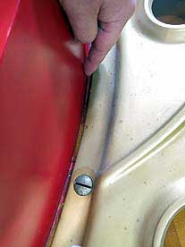 フレーム淵の赤い塗料の割れアガリ 雑音の原因にもなるので削除したいがフレーム下までは手が入らない