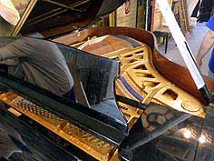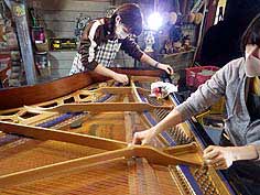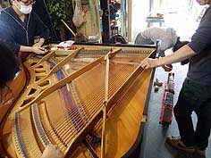 重量物なゆえに慎重に取り扱う危険が伴うところありだ、 こん包を解いたら仮足をつけてピアノ本体を起こす