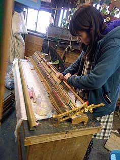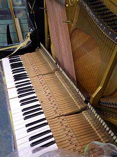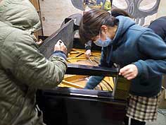 ピアノを寝かして底板の取り外し〜^底板はカビシミ〜〜虫食い