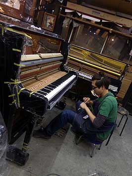 ピアノを寝かして底板分解作業