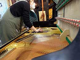 ピアノを寝かして底板を取り外す作業ピアノは寝かすと見えなかったところまで見える