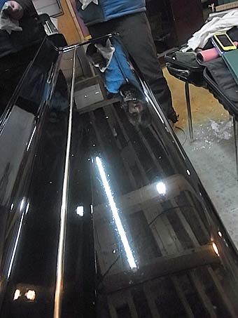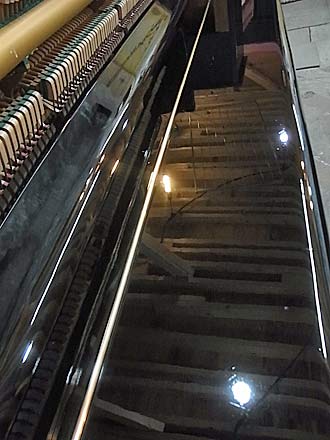 ピアノ下前パネル磨き大きなきずは取れないが光るだけで十分イメージが変わるのだ
