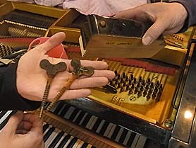けん盤下位置にあるバランスキーピンとフロントキーピン関係このピンはタッチ感触に大きく影響するところでもあり鍵盤運動に摩擦抵抗を少しでも少なくするためにピカピカに磨いあげる必要があるのだ