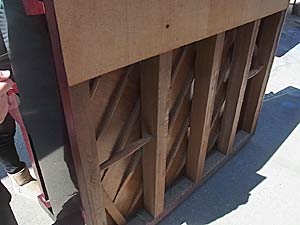 ピアノを寝かして底板分解作業 底板のつきいたは湿気ではがれてしまっている