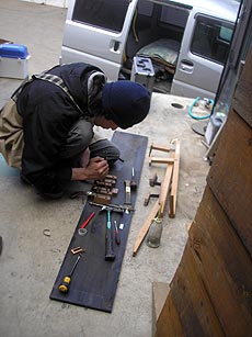ピン板修理、臍穴(した穴)をあけビスを入れていく、このときビスの太さは