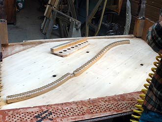 一度フレームを乗せますそしてボルトを締め弦圧のチェック、そしてまたフレームをおろします、げんあつの無いところを出すべくカンナで決めた寸法を取り去りげんあつを出していきます、