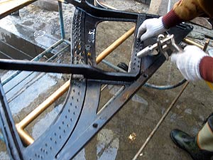 ペダル天秤軸部分の製作。軸になる部分の鉄の棒がすっかりさび付き