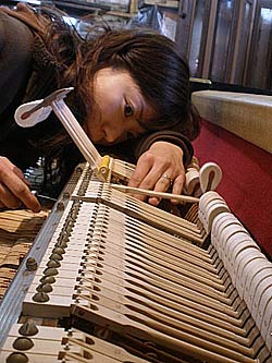 ヤマハG2弦はり開始、ピアノ線はドイツのレスロー社のミュージックワイアーが張り込まれます。