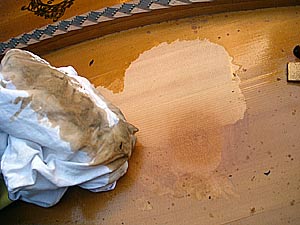 古いニスが落とされたヤマハG5、生地目をきれいに整える