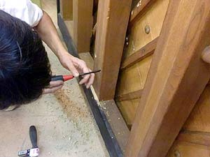 支柱を取るわけにも行かないので支柱に穴を開け響棒の修理穴を開けた支柱は埋木で元通りに、こういう面倒な作業が次から次と出てくるのだ