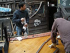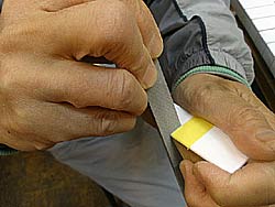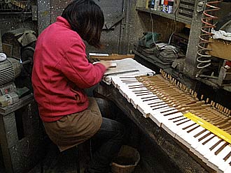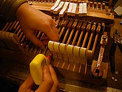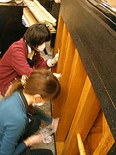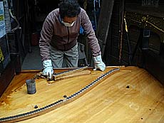 鍵盤貼り込み、貼るのは簡単、次の研ぎだしで鍵盤貼り込みのすべてが決まる、指先での感触のところだ