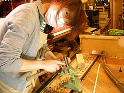 前回の直しの際にチューニングピンがかなりのサイズが打ち込まれていた、おなじサイズは無理なのでさらにオーバーサイズがはめ込まれるに当たり