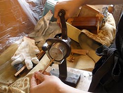 古いブッシングを剥がしていきます、今度のブッシングはレンナー(ドイツ製)カシミヤが入ります