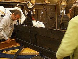 弦をはずし、フレームも降りれば響板にかかる張力はゼロということになる、弦が張り込まれているときは張力圧で割れているところでも開いてこない