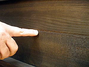 ボンドはタイトボンドを使用し、その水分でたたいて圧縮された木材の膨張で木目割れ部分に十分圧着するように埋め込みます