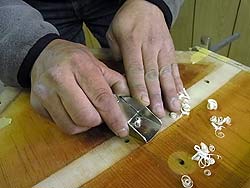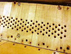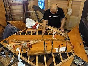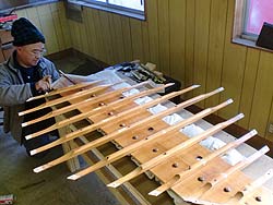 共鳴板のわれを直し,埋木を施して1枚1枚板を張り合わせていく
