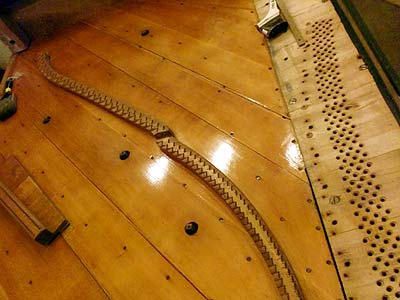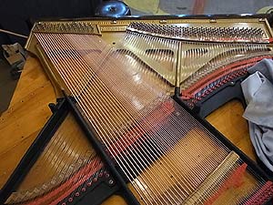 この写真を見ただけでピアノとは到底思えない、床下のはりの部分が出てきたような感じだ