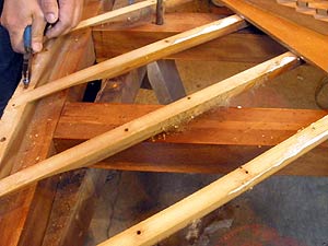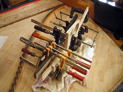 響板をいったん剥がす、骨(響棒)が剥がれているためにおろしました