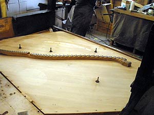 響板表面の止められていたビスを全て排除し、響きを余すとこなく響かせるために