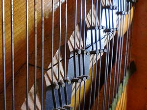 これ一枚割れているだけで音は死んでしまう、音は駒を伝い共鳴板に響く響棒はその共鳴板柾目を伝う音を垂直に四方に音を広げる役目だ