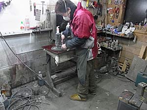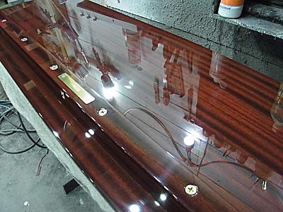 ピンブッシュ穴あけ作業そしてレスロー弦の張り込み作業
