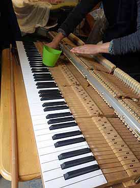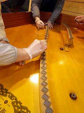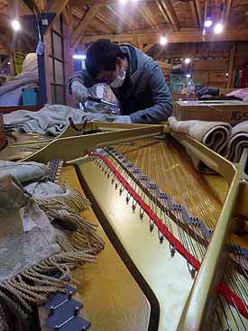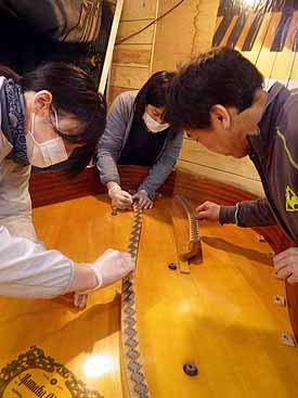 この鏡を使う作業はハンマーが弦に対して同時打弦っさせなくてはならない、そり走りねじれ等を正確に補正調整していく