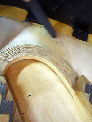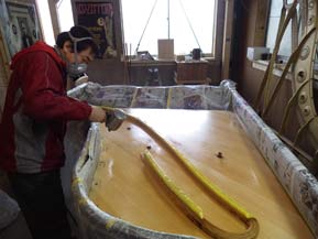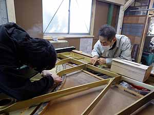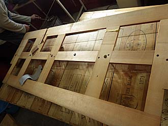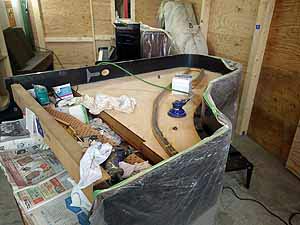 古い共鳴板のニスを落とす。この時のにおいが強烈〜〜