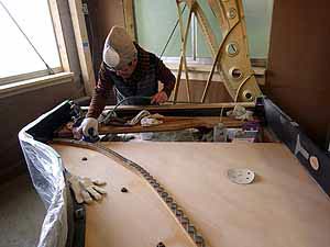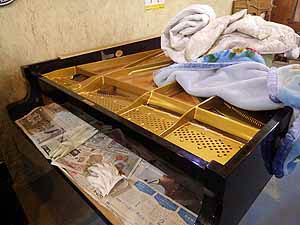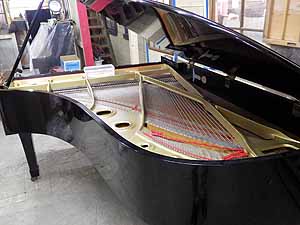 C7グランドピアノオーバーホールの開始 弦関係〜〜細かいところまで確実にチェック作業を施して新品同様の輝きを取り戻します