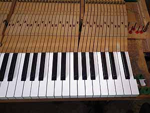 鍵盤を押すとこの部分のからくりも同時に連動してダンパーが上がり発音する このレバー系のフレンジが動かないとタッチの感触に大きく影響する。