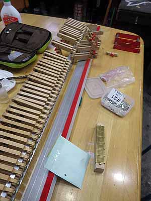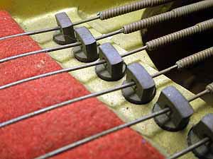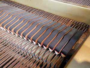 平ダンパーの作り直し バスのダンパーフェルトは弦を張りこんだあと合わせながら接着していく