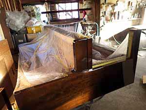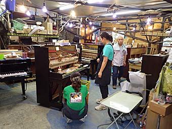 じっくりとチェックを繰り返しながら分解準備 ピアノを寝かし底板分解