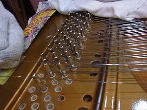 ある程度緩んだら弦をカット取り外してチューニングピンを抜いていきます