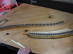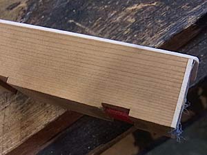 共鳴板われ埋め木修理 本体の割れ溝をテーパーに削り込む 埋め木用のスプルスをこれもテーパーに削る