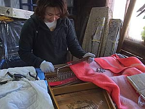 研ぎ出し作業 表面はつるつるが好ましい 薄くきれいに仕上げるのがコツ