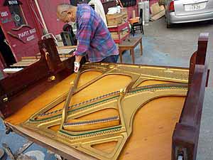 フレームが下りたピン板がむき出しの状態、ピン板チェック ヤマハピアノはピン板が割れまくる