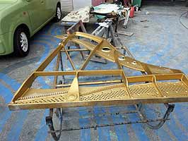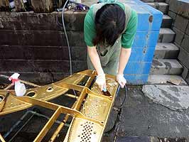 ピアノを表にだしてフレーム洗浄と共鳴板のふるいニス落とし