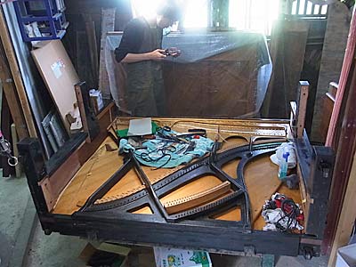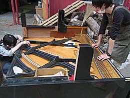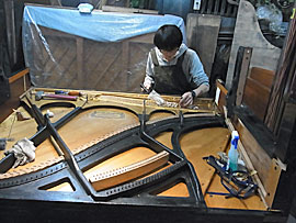 カワイのピアノに今度はドイツ製のレスロー弦を張りこんでいく